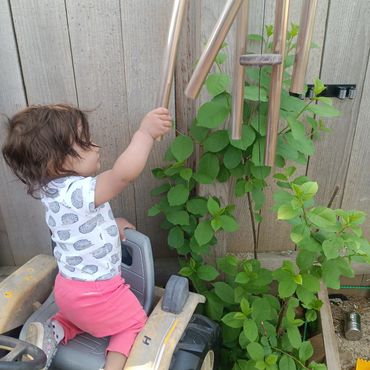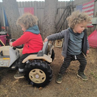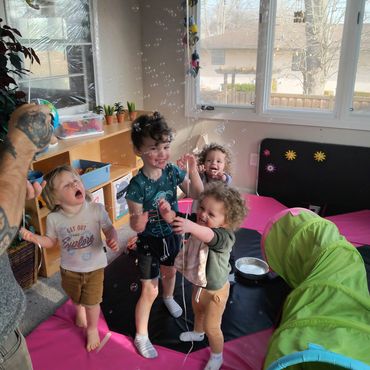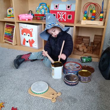 Remo hand drums, Ukulele Sprouts Curriculum, and Boomwhakers are woven into trauma-informed and evidence-based SEL (Social Emotional Learning). A space for calming down with intentional tools is foundational to our days, so that children form safe attachment with me as a caregiver and learn methods of coregulation and self-help that empower their brains to function optimally. As mentioned, there is also occupational therapy inspired sensory and gross motor work with gym mats, a Jungle Jumperoo, crash pad and sensory swing.